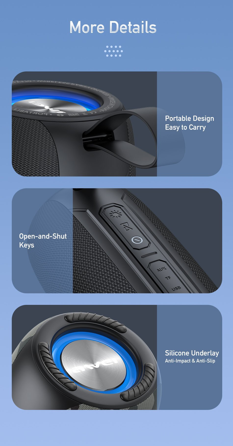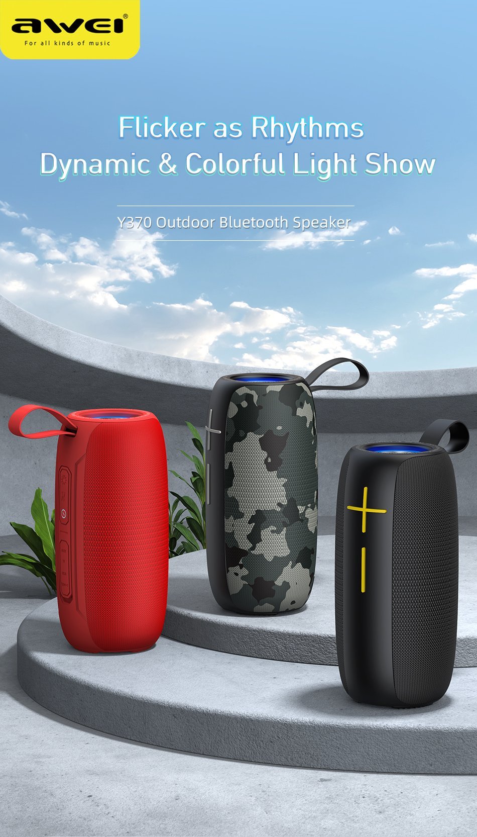 Awei Y370 Original Bluetooth Speaker Music Super Power Bass 20W IPX5 Outdoor HiFi 3D Sound Bar With Led For PC