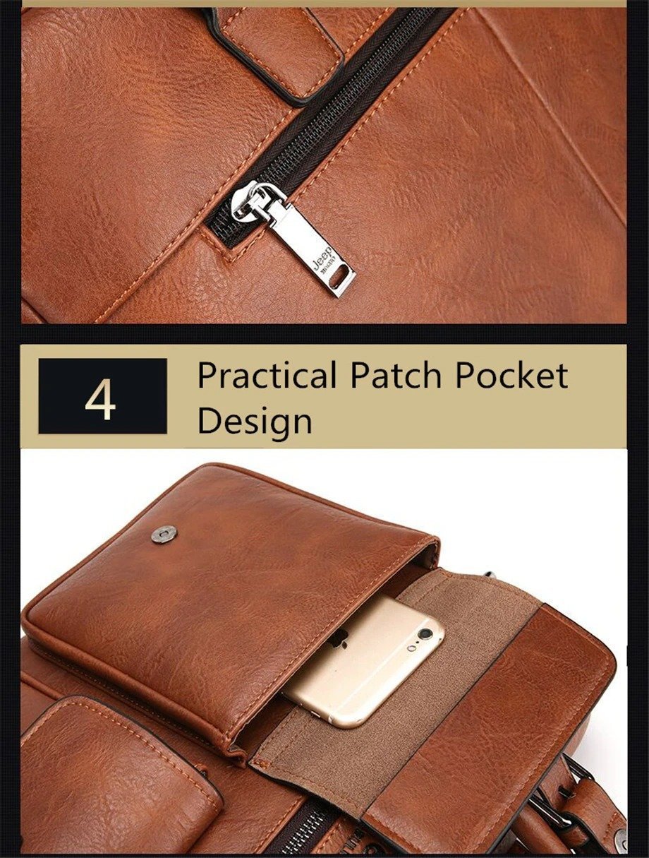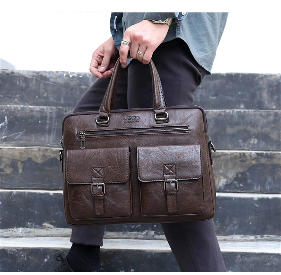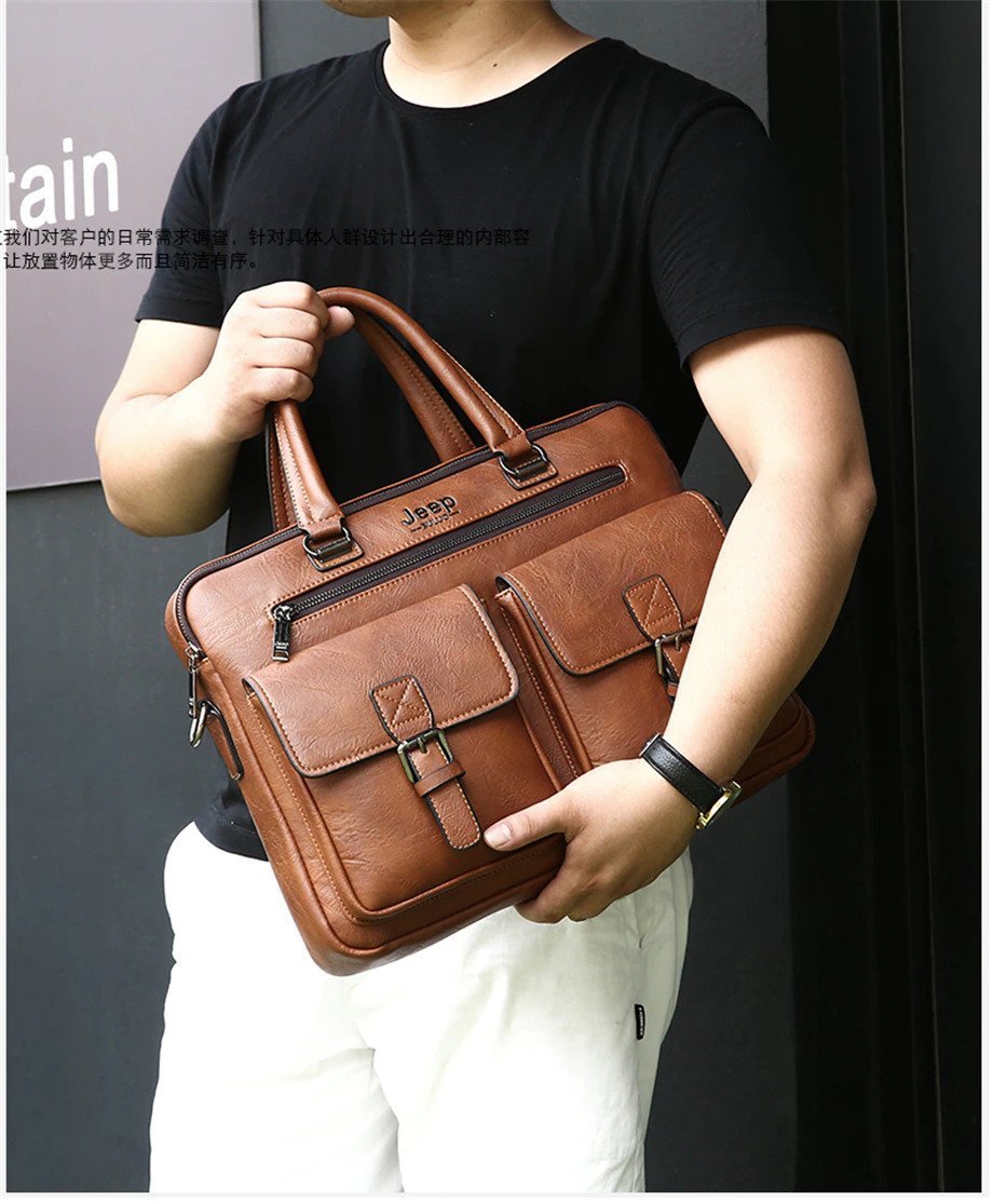 Leather pouch made from high quality materials which fits work with multiple pockets and laptop fits